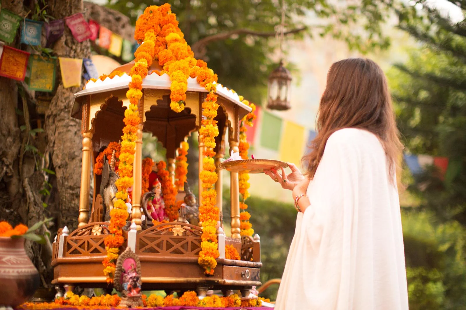In the Vedic and Tantric tradition there are many different types of rituals. A common ritual oftentimes done on a daily basis in the East is Goddess “Puja”The intention of the puja is to invoke the support of nature by offering the elements to the goddess. It is a ritual that consists of physical offerings and the chanting of different mantras.This practice is especially powerful for women, tuning into the natural grace of the divine feminine. It allows us to connect to vertical love. Practicing puja also helps to strengthen the aura and increases our power to manifest and creative.